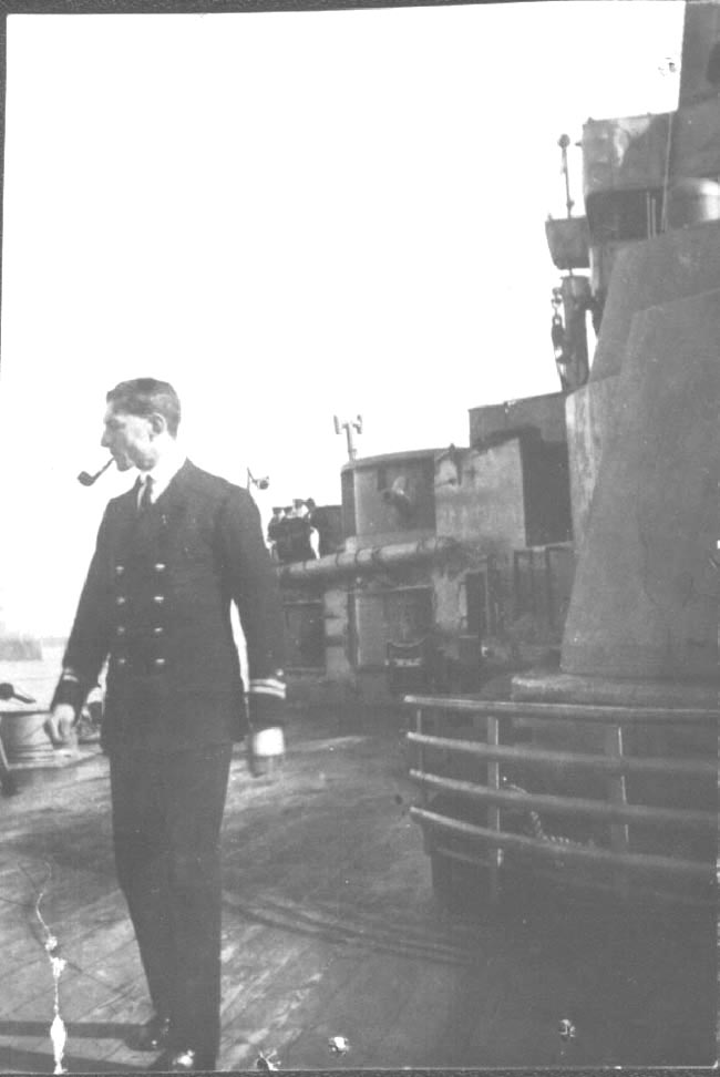 Undated photo of Lieutenant George Bradford. . strolling off duty along the deck.